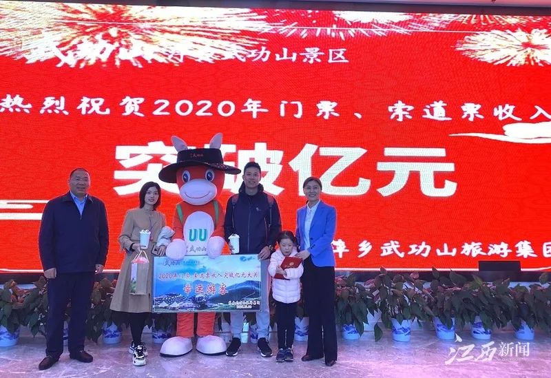 10月6日11时,萍乡武功山游客服务中心大厅热闹非凡,在众多游客及景区工作人员的欢呼和见证下,来自南昌的游客张文文成了2020年萍乡武功山景区门票、索道票收入突破亿元“幸运锦鲤”游客,获得景区颁发的相关奖牌、纪念证书及景区年卡等奖品。