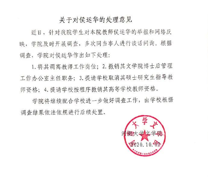 10月7日下午,河南大学文学院通报称,对涉嫌性骚扰女学生的教师侯运华作出处理:调离教师岗位;撤销其文学院博士后管理工作办公室主任职;提请学校取消其硕士研究生指导教师资格;提请学校按程序撤销其高等学校教师资格。
