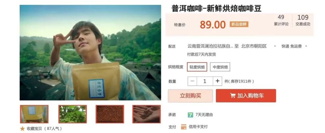 本片结尾,李佳琦在直播平台,亲自为普洱咖啡带货,本色亮相。