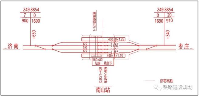 新建枣庄南站规模为 2 台 6 线(含正线 2 条),设 450m×13m×1.25m 岛式中间站台 2 座,设 12m 宽旅客地道 2 座,站房场坪 210m×110m,停车场场坪155m×110m,站房采用线侧下式布置。