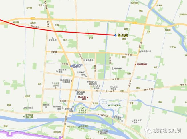 台儿庄站规模为 2 台 5 线(含正线 2 条),设 450m×12m×1.25m 岛式中间站台 1 座,450m×12m×1.25m 侧式站台 1 座,设 12m 宽旅客通道 2 座,站房场坪 180m×80m,停车场场坪 180m×80m,站房采用线侧下式布置。