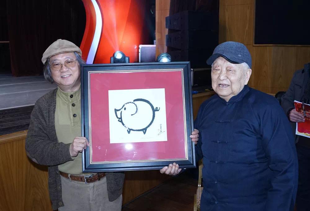 2019年上海文艺界新春茶话会上,上海市美术家协会主席郑辛遥将自己的漫画作品《猪圆日润》赠送给了现场最年长的本命年艺术家,上海民间文艺家协会会员、上海市曲艺家协会会员、儿童文学作家孙毅。