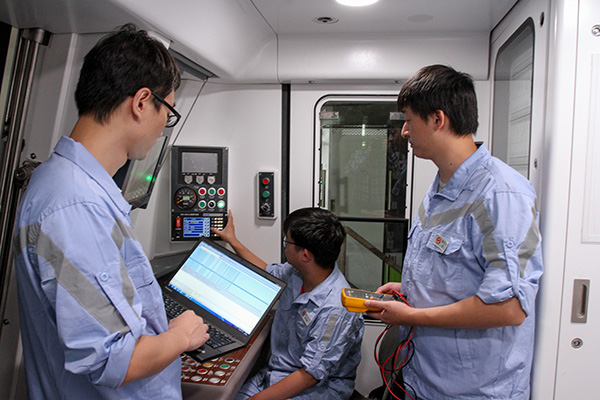地铁工作人员对2号线双信号系统进行验证、调试。本文图片 上海地铁提供
