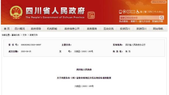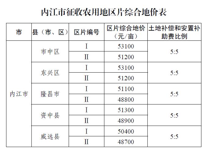日前,四川省人民政府下发《关于同意各市(州)征收农用地区片综合地价标准的批复》,同意各市(州)制定并经自然资源厅审核的征收农用地区片综合地价标准,该标准于2020年1月1日起实施。其中,公布了内江征地补偿标准