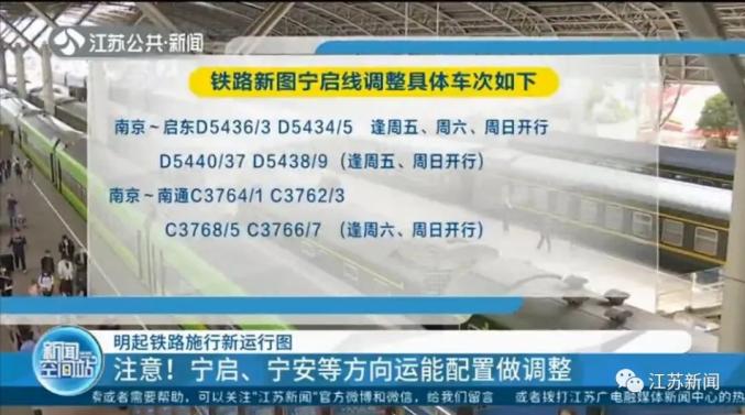 新图中,铁路南京站对南京至南通、启东等方向的运能进行了优化,新增宁启方向旅客列车4对,进一步补充了南京至启东、南通周末时间段铁路的客运运能。