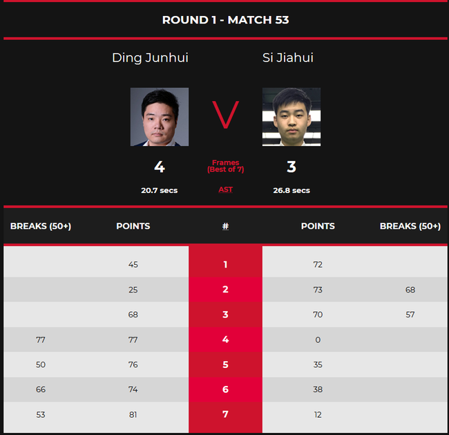 本场比赛,斯佳辉借着丁俊晖开局状态不佳,连下三局,以3比0领先。直到第四局,丁俊晖终于打出了自己的节奏,先是单杆77分,挽回一个赛点;随后打出单杆50,并且凭借一杆防守,再次扳回一城。