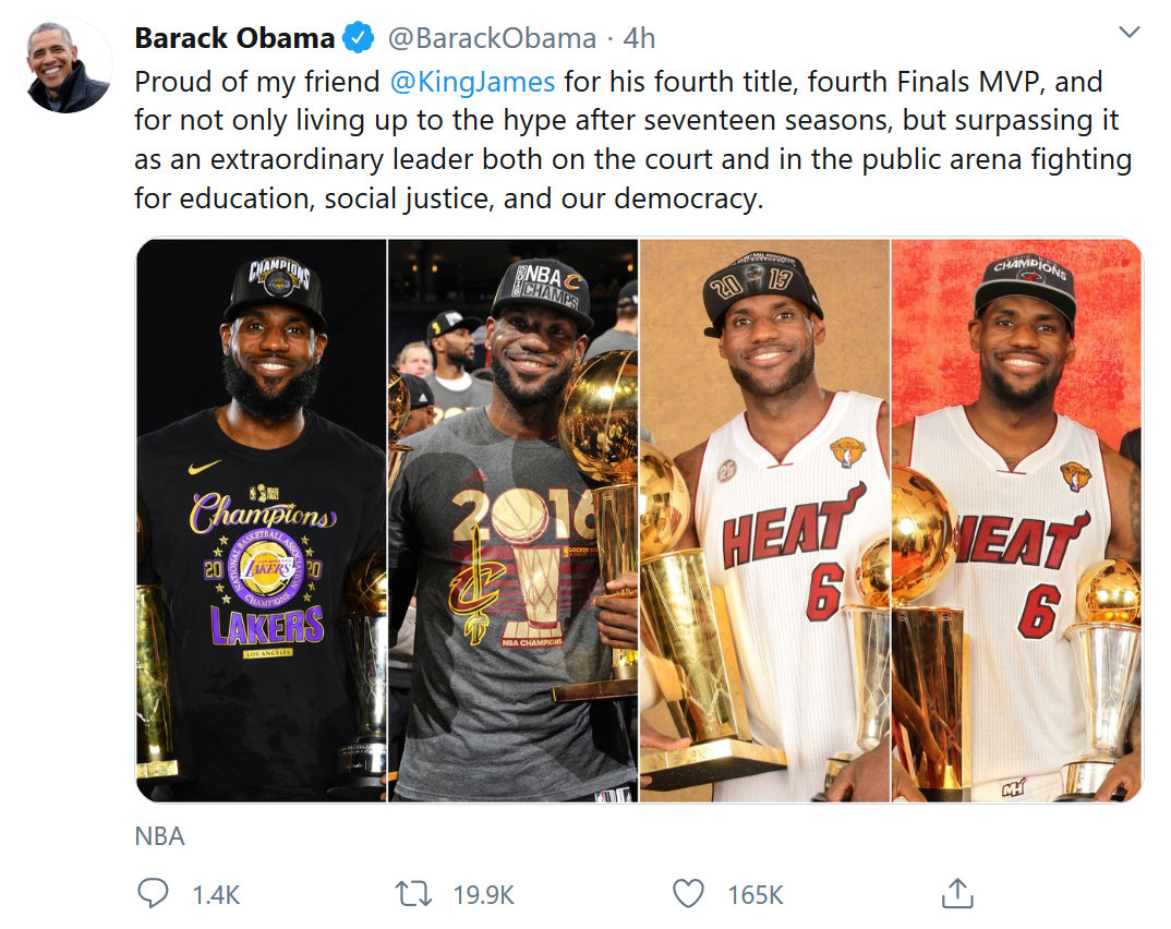 值得一提的是,在詹姆斯代表第三支球队赢下了自己的第四个总冠军之后,一直热爱篮球的前美国总统奥巴马也在社交网络上祝贺了詹姆斯,并称赞他在多个领域都是当之无愧的领袖。