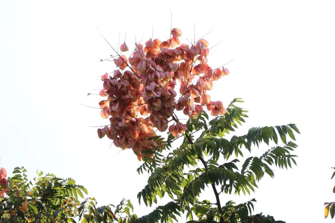 栾树又名灯笼树,只因栾树蒴果是三瓣又薄又脆的果皮围拢成的三棱形模样,像极了灯笼。台湾美学家蒋勋在《此时众生》里写过栾树,他写到:普通植物大多是花儿极尽娇艳诱惑之能事,果实则像怀孕了的妇人般安静满足,仿佛所有的激情骚动都平静了下来,然而像栾树这样的植物则相反,它的花儿是害羞谦逊的,果实却艳红一片,如火般炽热。