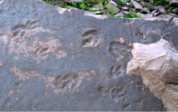 所以它只有地质学上的意义,如鉴定地层是否逆转,鉴定恐龙足迹形成时的地质时代,以及提供古地理学、古生态学方面的信息。 而另一个方向则是研究这些恐龙足迹在生物学上的意义。专家们认为,恐龙足迹能清晰地反映出造迹恐龙脚的构造,能区分是哪一大类恐龙留下的。通过足迹,我们可以知道造迹恐龙的体长、体重,可以知道它们是怎样行走的——有的恐龙是跖行的或半跖行的,有的是趾行的。成群的足迹能反映恐龙群居、迁徙的情况,有时也能反映肉食性恐龙与素食性恐龙之间的争斗情况,以及恐龙之间的关系等。