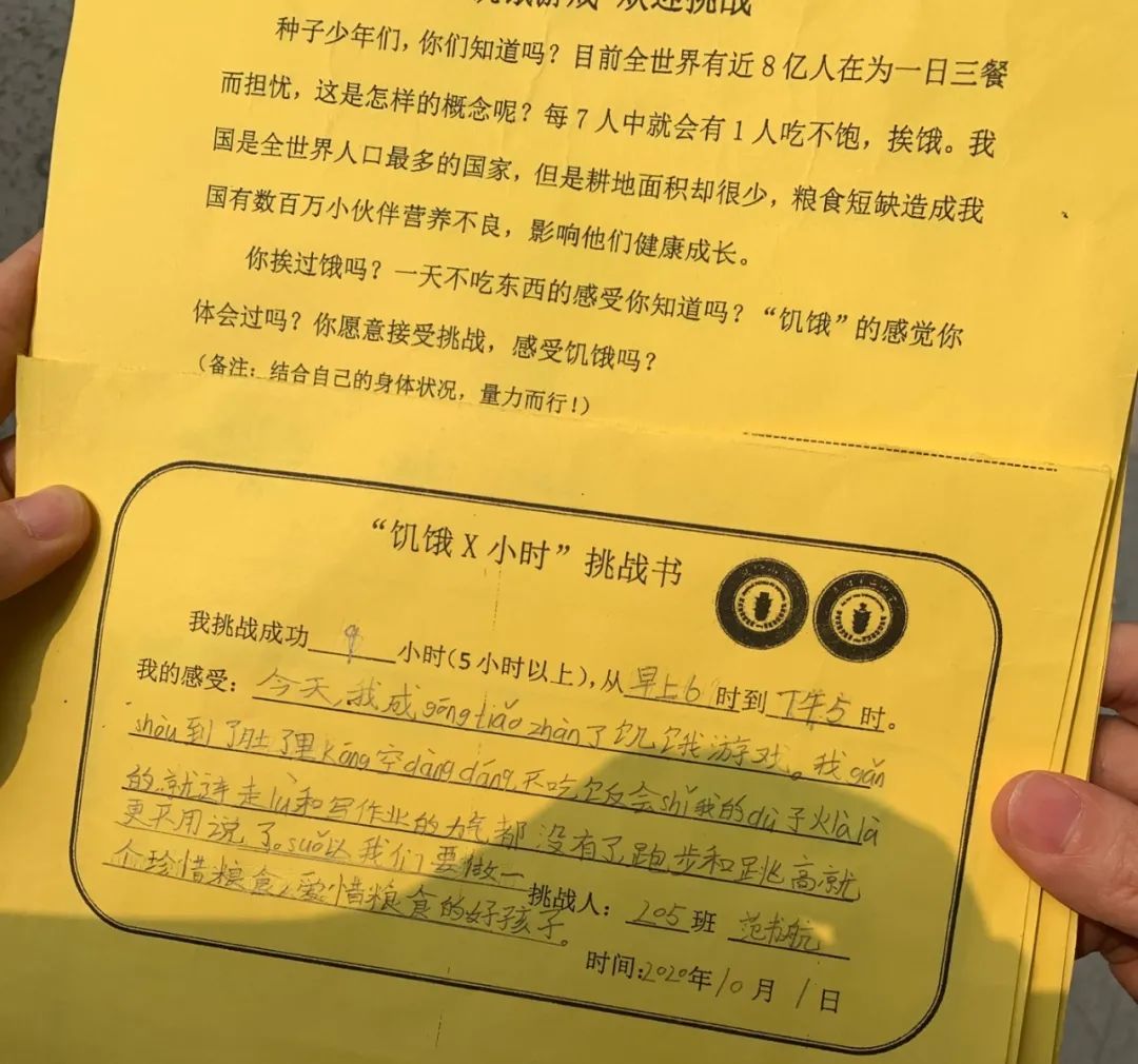 就在记者采访戚老师的间隙,多位二年级的小朋友跑了过来告诉记者:“我参加了我们学校的饥饿挑战,坚持了6个小时不吃东西!”“我坚持了5个小时!”