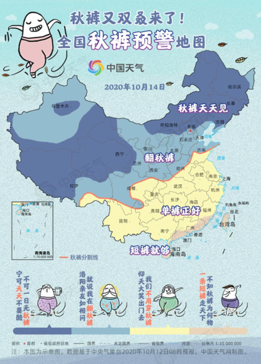 随着多地气温创今年下半年来新低,秋裤开始频繁刷存在感。昨天,秋裤分割线已推进至,河北、山西、陕西、甘肃、川西高原一带。到了今天,秋裤“占领的地盘”还将继续扩大,南进到山东、河南、湖北西北部一带。