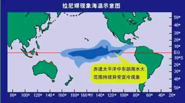 我们所说的拉尼娜状态(事件)指的是赤道中、东太平洋海水表面温度与常年同期相比出现大范围偏冷,并且强度和持续时间达到一定条件的现象。