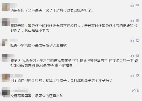 孩子的亲妈称,这并不是第一次打孩子,之前自己就因为这件事情报了警。视频中,孩子的父亲回应道,妻子并不是对小孩不好,孩子的作业平常都是她辅导,打小孩打得确实重了点,这方面需要改正,如果以后还发生的话就会跟她离婚,还要告她。