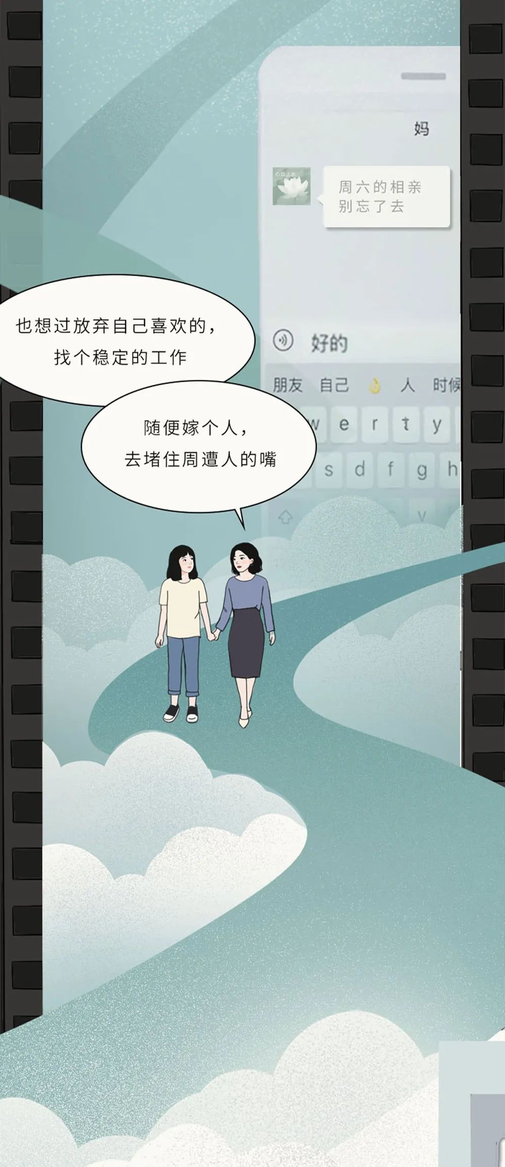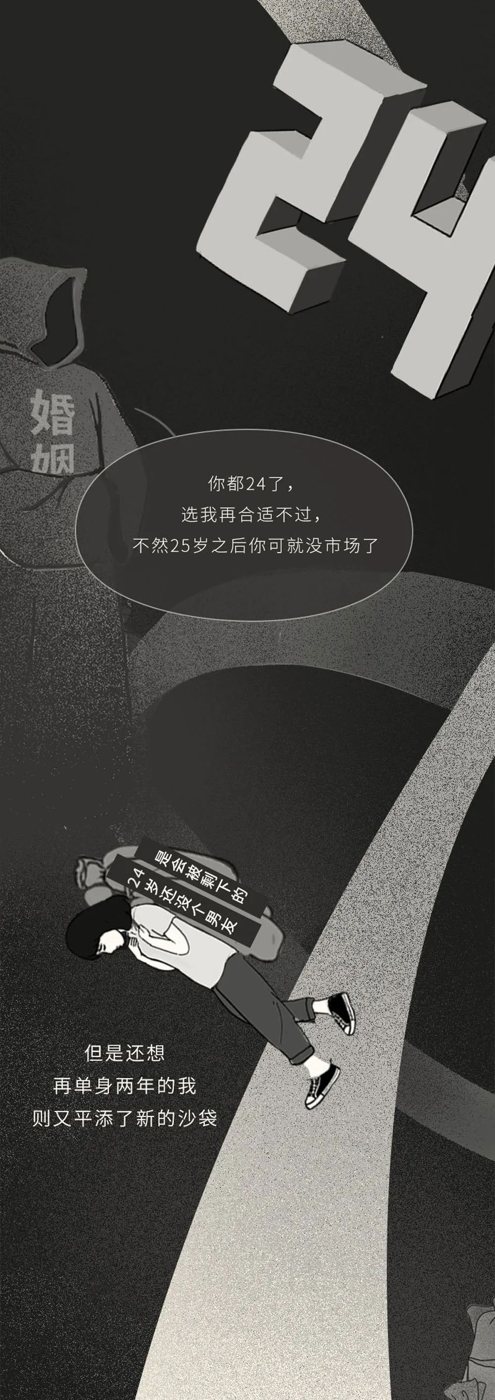 而背负上类似“25岁还不找男朋友以后就更没人要了”“再奋斗几年又能挣几个钱”“女孩子家家打拼事业有什么用反正最后都要嫁人”等无端端的压力,而“结婚”这件事好像随着年龄数字的增加,成为了女性迫在眉睫需要完成的一件事。