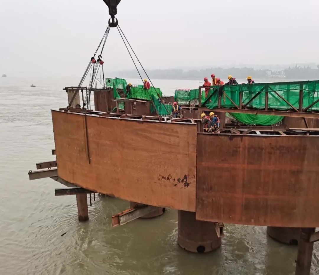 今年长江汛期之前,白沙长江大桥项目组总结历年水文气象资料,结合实际施工条件,调整施工计划,采取先桩后围堰施工方式,完成南岸主桥墩水下桩基施工。汛期来临,南岸主墩围堰及承台浇筑被迫搁浅。随着水位逐渐下降,南岸工区已经进入承台施工前期准备阶段。在施工现场,数十名工人协同配合,未来10多天里,他们要完成一个直径约40米,高约17米的巨型异形双壁钢围堰的拼装。