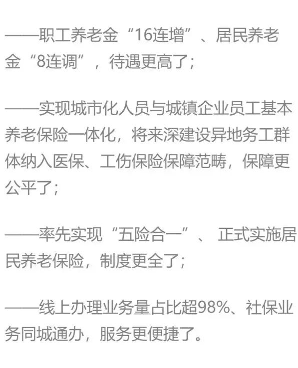 目前,深圳已建立起包括企业职工基本养老保险、地方补充养老保险、企业年金,机关事业单位养老保险、职业年金和居民养老保险等广覆盖、保基本、多层次、可持续的多层次养老保障体系,助力“老有颐养”。