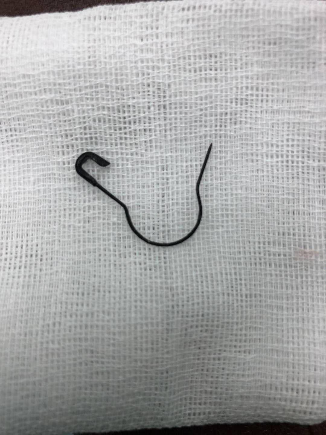 “从形状看,这个别针有点像衣服商标上的别针,也许是家人购物留下的。”毕静医生推断说。她和科室里其他医生,经常半夜回医院给孩子做气管异物手术,被取出的异物五花八门,有果仁、果壳、骨刺、小塑料制品,还有各种尖锐物。
