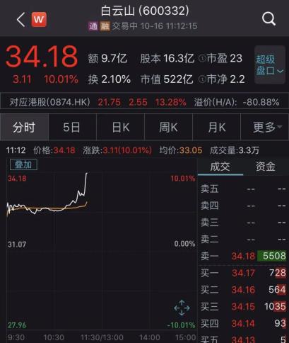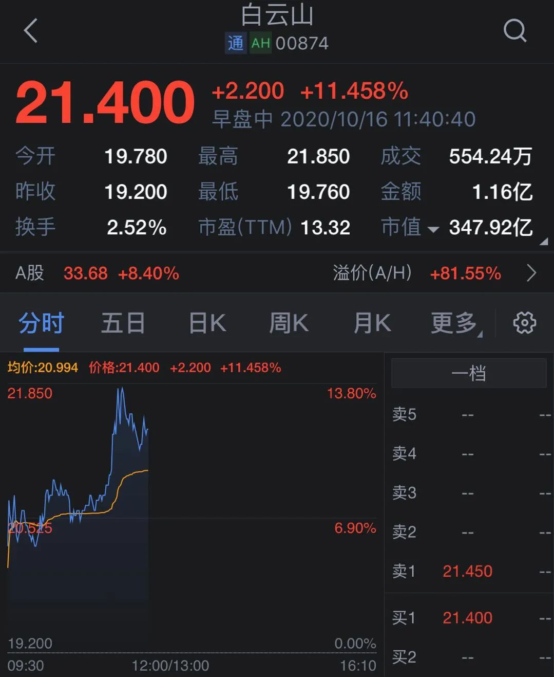 在上述消息的影响下,被媒体特别点名的国内老牌中成药龙头白云山,今日早盘股价大涨,其中A股上午盘中一度触及涨停,H股更是一度涨超13%。