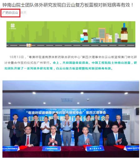 媒体报道钟南山院士称白云山板蓝根对新冠病毒有效
