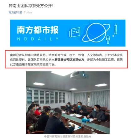该报道还称,该预防凉茶处方经一线医护人员服用后,身体状况一致反应良好,得到了不少医护人员的青睐。