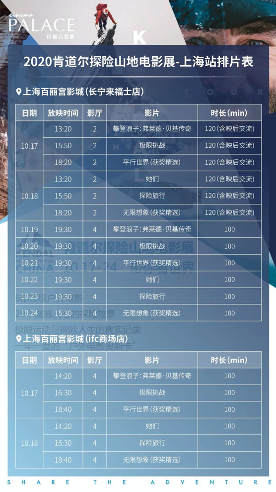 “2020肯道尔国际山地电影展·上海站”排片表 肯道尔国际山地电影节微信公众号 图