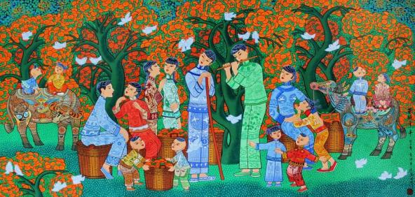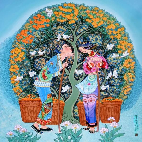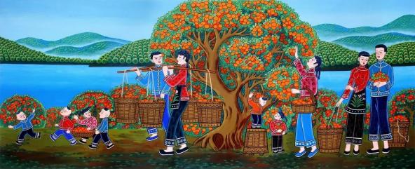 桔子红了,鸟语花香。勤劳的人儿,桔树下窃窃私语,用辛勤的劳动创造了生活本身和精神意境。勤劳是华夏子孙的传统美德。