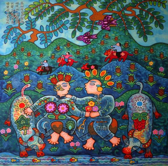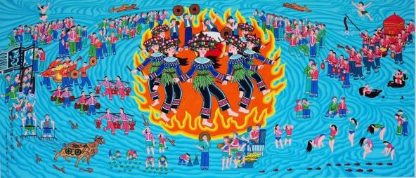 作品名称《蓝田瑶家舞火狗》(获2000年全国农民画等奖)