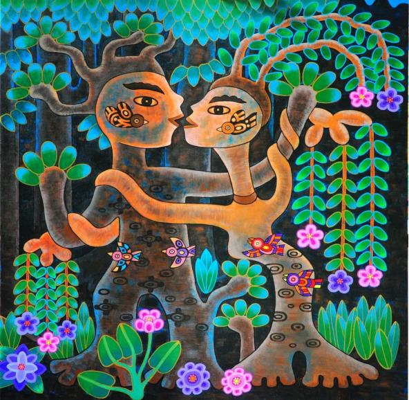 入山又见藤缠树,出山看见树缠藤。啊哥缠妹妹缠哥,妹想啊哥死也缠。在社会主义新农村建设下,农民脱贫攻坚奔小康,过上了幸福的好日子,物质与精神生活都得到了极大的满足。藤缠树、树缠藤,正是农民用客家山歌唱出生死相随、至死不渝的爱情。