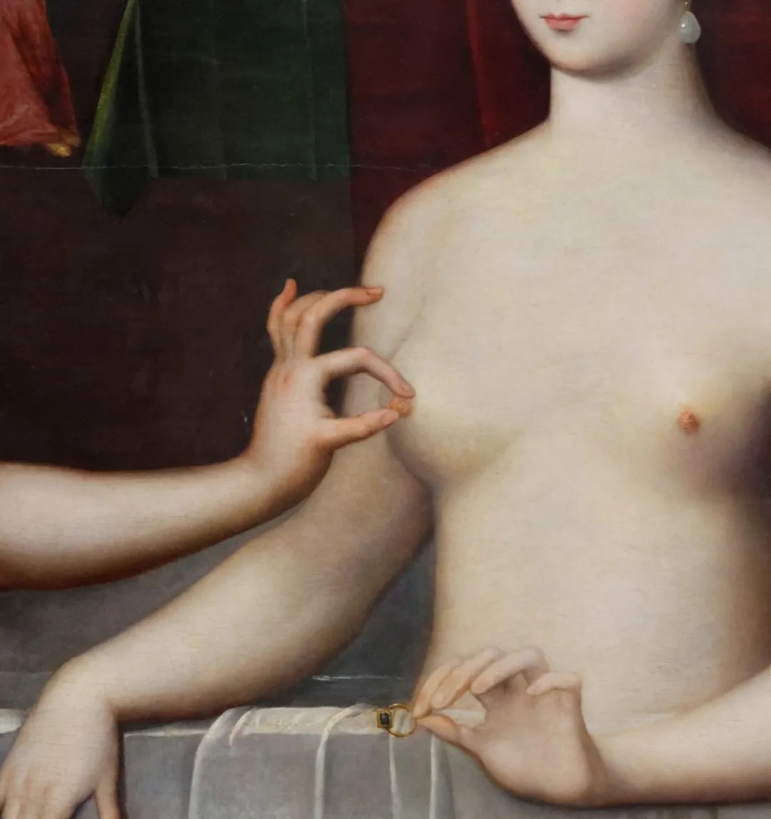 指环,作为一种最为常见的珠宝首饰,是财富、友谊与爱情的象征,是婚恋盟约的信物,更是女性的隐喻。在很多西方画作中,指环都是一种充满暗示意味的道具。比如下面这幅藏于巴黎卢浮宫的十六世纪法国宫廷枫丹白露画派代表作《加布里埃尔·德·艾丝特雷和她的一位姐妹》: