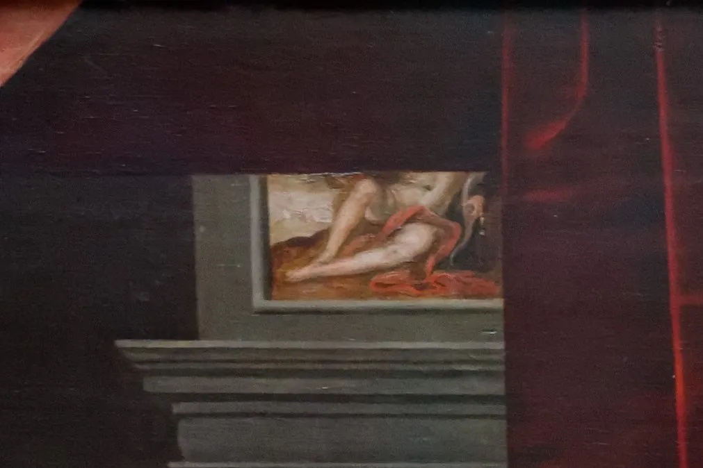 有趣的是,加布里埃尔腹中孩子的父亲、画中这对儿塑料姐妹花的男人——法王亨利四世——也在画中:女仆身旁的壁炉上方挂有一幅画,画中瘫卧着一裸男,他的面庞被红帘遮住了,只留下画作的一角隐约可见: