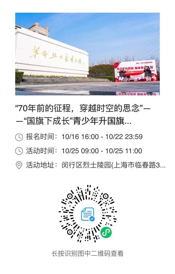 本月10月25日是中国人民志愿军抗美援朝出国作战70周年纪念日。当天上午9点,莘庄工业区团工委将举办70年前的征程——2020年“国旗下成长”青少年升国旗仪式暨纪念抗美援朝出国作战70周年主题活动,诚邀园区的小朋友们一起感受一次特殊的升旗仪式,届时还将有精彩的爱国主义宣讲活动,仅限30人,先报先得,赶紧行动吧!