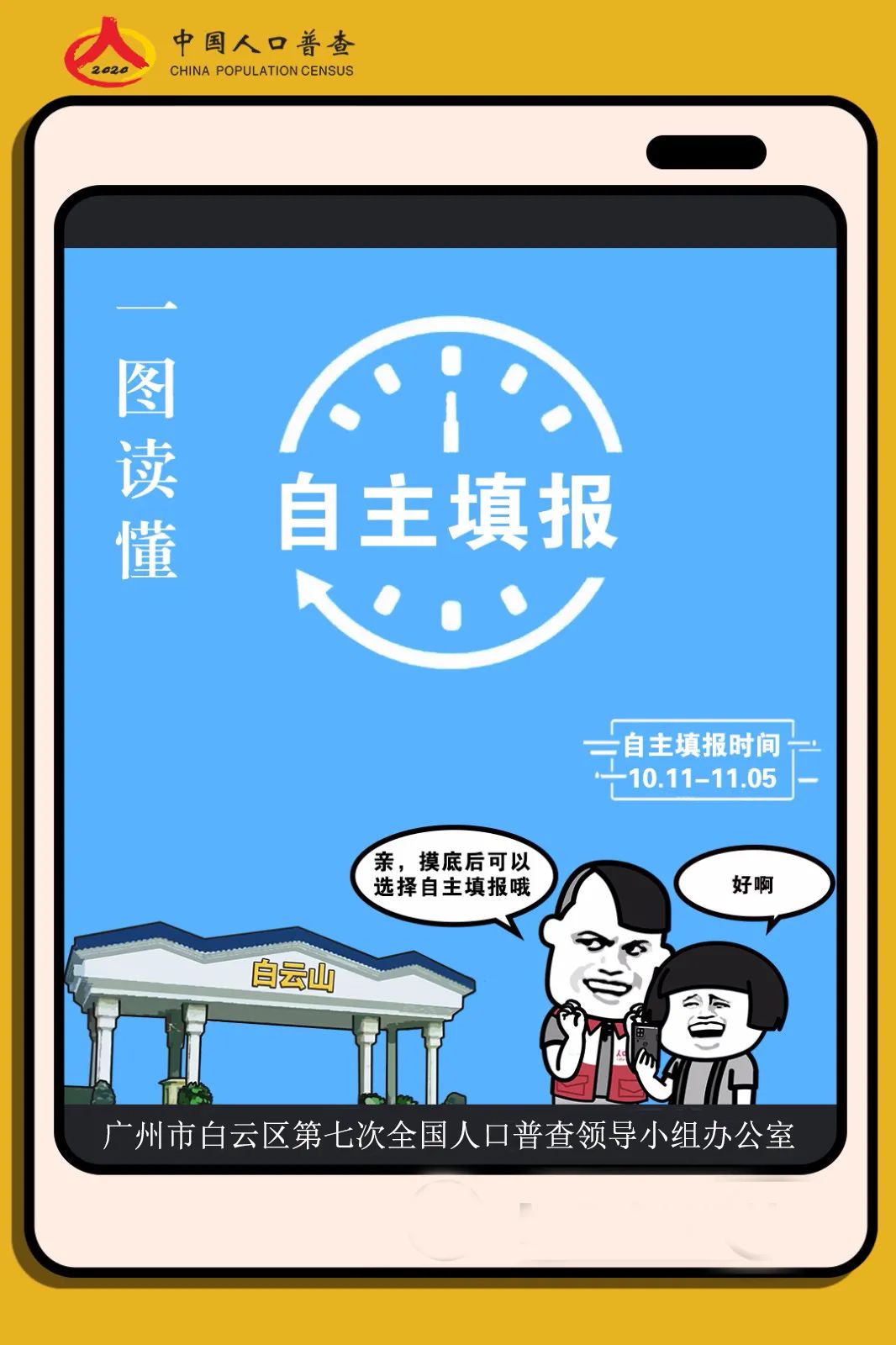 二、自主填报时间是10月11日至11月5日,如您未在规定时间内完成自主填报,普查员将于11月6日至11月15日再次入户为您登记。