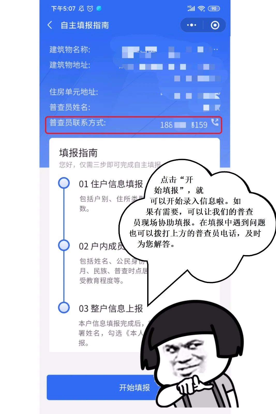 本次普查采用电子化方式登记,摸底期间普查员将上门了解住户基本信息并用电子采集设备(智能手机或PAD)填写上报。如果住户选择自主填报,可以在摸底时告知普查员,普查员将用电子采集设备生成二维码供住户扫描填报。要注意的是: