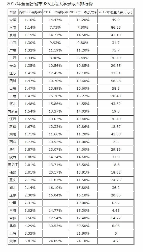 5.81%的成绩,也远超过全国平均2%左右的985高校录取率,是车尾选手安徽、河南、贵州等地的五倍以上。
