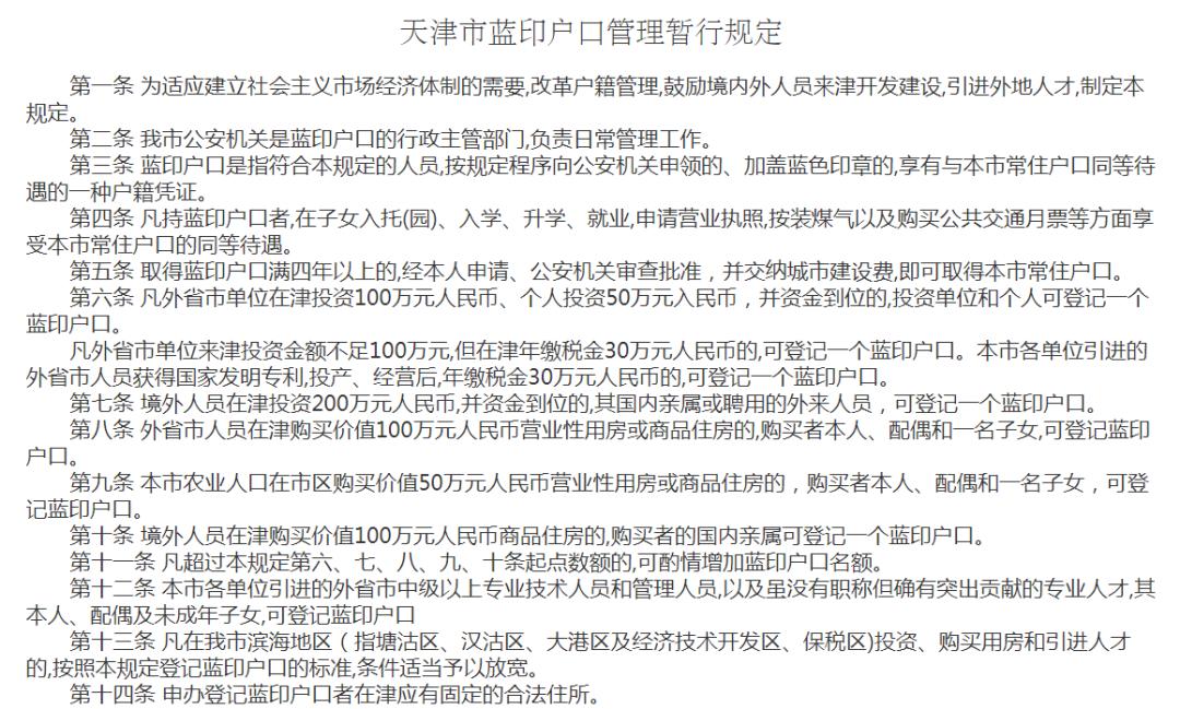 2009年2月,天津曾对异地高考政策进行改革,新的蓝印户口规定出台,入户门槛改为需“一次性付款购买40万-80万元的新建商品房”。