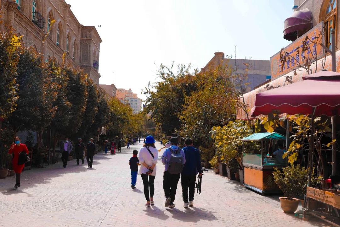 古城的春夏秋冬都各有特色,但是最让人喜欢的还是古城的秋天。上午坐在古城巷道的长椅上,温煦的阳光慢慢穿过金黄的树叶空隙照在身上,懒懒的、暖暖的,身边不时有来往的游客、去学校的学生、退休的大爷大妈……看着这些形形色色的人群,眼前是五颜六色的蔬果摊,耳边时不时响起小贩高声的叫卖、讨价还价的声音,偶尔夹杂着妇女们讨论家长里短……热闹的市井生活气息扑面而来,即使坐一上午,也不嫌烦。喀什,适合你慢慢品。