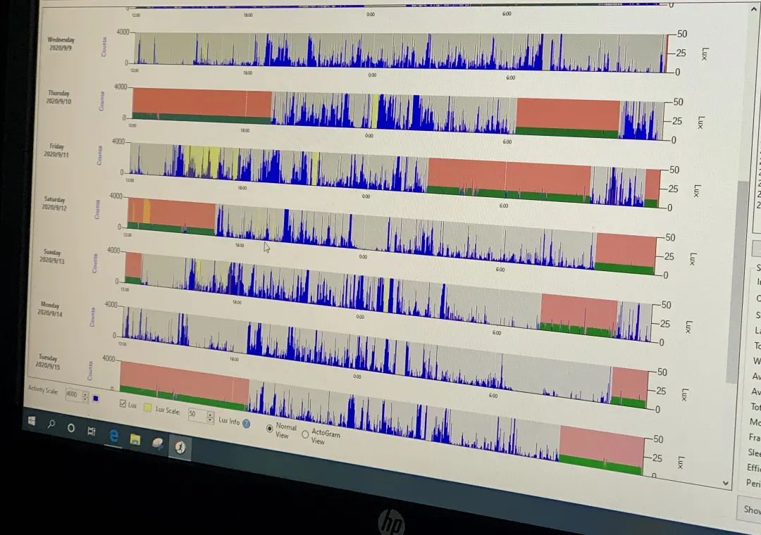 其实到现在我也没有很懂这个治疗是怎么干预行为的。类似运动手表但是没有表面的体动记录仪会记录我的睡眠、运动和光照,医生每周导出折线图监视我过去一周的情况。此外每天睡前和睡醒都要填睡眠日记,是一份固定的问卷,登记自己每一天的作息,有没有吃饭,几点吃,有没有运动,几点动,有没有睡觉,几点睡,有没有喝含咖啡因的饮料,几点喝,等等。