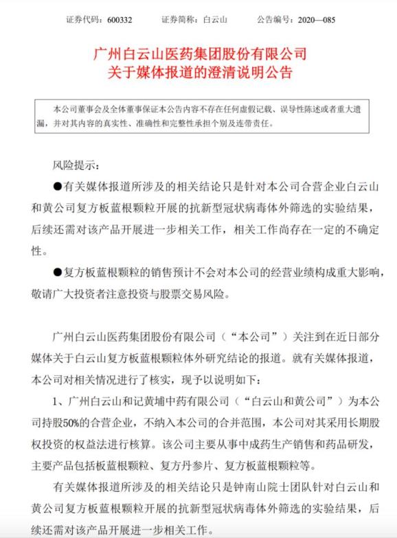 10月18日,白云山公告,有关媒体报道所涉及的相关结论只是针对本公司合营企业白云山和黄公司复方板蓝根颗粒开展的抗新型冠状病毒体外筛选的实验结果,后续还需对该产品开展进一步相关工作,相关工作尚存在一定的不确定性。复方板蓝根颗粒的销售预计不会对本公司的经营业绩构成重大影响。同时表示,目前,板蓝根产品在国内市场已是充分竞争的产品,板蓝根颗粒、复方板蓝根颗粒已获批准的文号数量众多,板蓝根产品不是公司或其附属企业的独家生产品种。