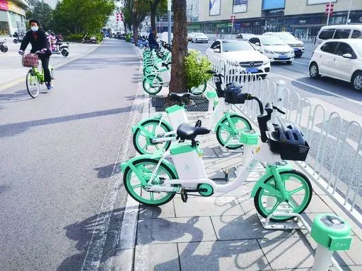 在市区主要路段和部分大型小区门口,已安装了共享电动自行车桩位。淡绿色的是滴滴出行的青桔共享电动自行车,蓝色的则是哈啰共享电动自行车。