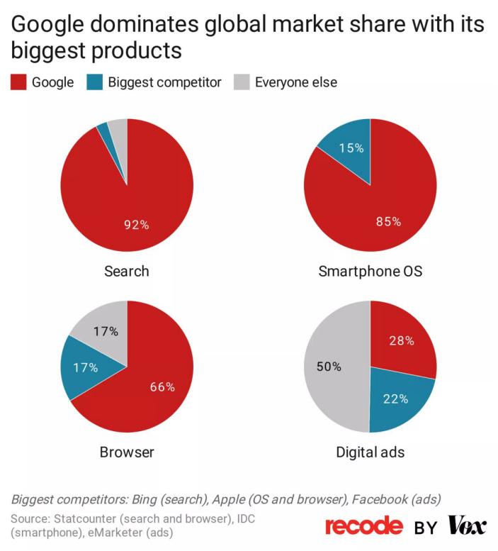 首先,必须存在垄断。起诉书称,从上世纪90年代一个大学研究项目,成长为全球市值最高达1万亿美元的最富有公司之一,谷歌是全球数十亿用户和无数广告商的互联网垄断者。多年来,谷歌占美国所有搜索查询的近90%,并使用反竞争策略来维持和扩展其在搜索和搜索广告中的垄断地位。