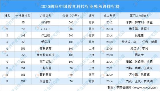 今年8月,胡润研究院发布《2020胡润全球独角兽榜》。其中,中国227家上榜独角兽企业中,出现10家教育科技行业独角兽企业,估值共计1610亿元。