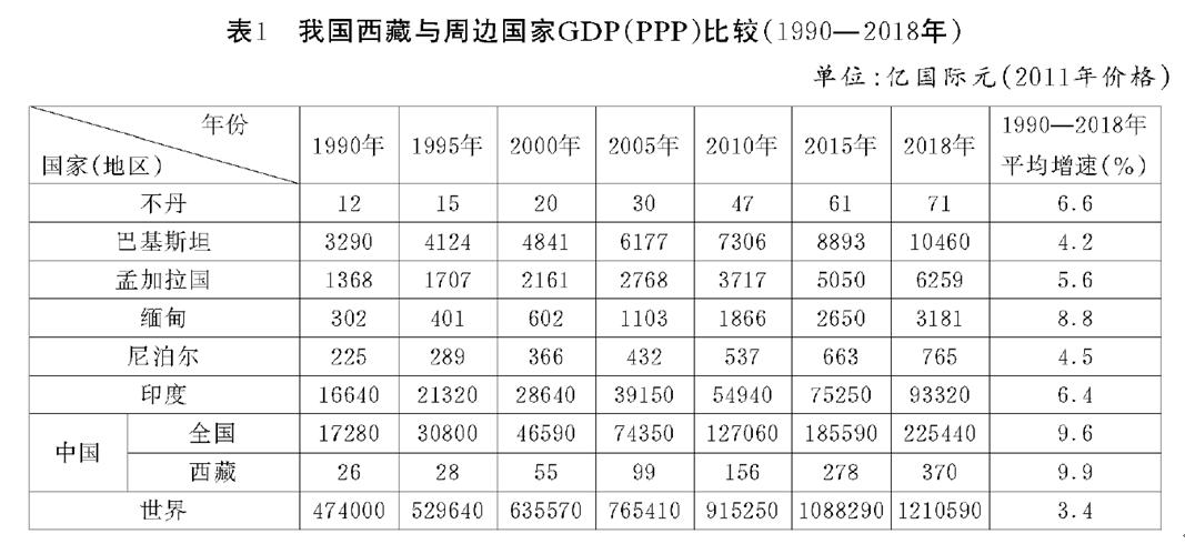 第一,1990年,我国西藏地区生产总值仅为26亿国际元,仅高于同期的不丹(12亿国际元),远远低于巴基斯坦(3290亿国际元)、孟加拉国(1368亿国际元)、缅甸(302亿国际元)、尼泊尔(225亿国际元)和印度(16640亿国际元),同期中国的GDP为17280亿国际元,占世界(474000亿国际元)的3.6%。由于西藏人口和市场体量有限,西藏地区生产总值和我国周边国家GDP进行直接比较显得有些单薄,但与自身发展相比,2018年的西藏地区生产总值达到370亿国际元,是1990年地区生产总值的14倍,实现了跨越式发展。