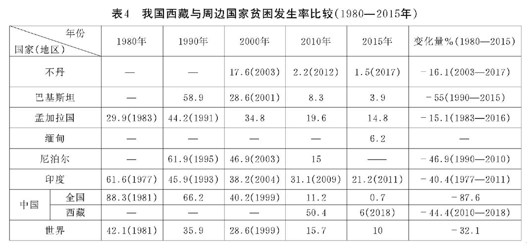 1.数据来源:http://hdr.undp.org/en;2.西藏数据系胡鞍钢等:《2050中国:全面建设社会主义现代化强国》附表:中国各地区人类发展指数(1982—2030)数据;3.由于1990年和2000年数据缺失,不丹HDI变化量和年均增长率均系2010—2018年。再次,从贫困发生率来看,消除贫困是当今世界面临的最大全球性挑战。中国贫困发生率从1981年的88.3%下降至2015年的0.7%,成为全球最早实现联合国千年发展目标中减贫目标的发展中国家,为全球减贫工作作出巨大贡献,创造了国际减贫史的奇迹。西藏作为中国唯一的省级连片特困地区和整体性深度贫困地区,始终得到中央重点关注,从脱贫攻坚开始,得到中央产业扶持资金已达500亿元,减贫工作取得显著成效。如果按照联合国每人每天1.9美元标准,从表4可以看出,1981年时中国的贫困发生率最高为88.3%,高于同期的印度为61.6%,更高于世界平均水平46.2个百分点;到了1999年,中国贫困发生率下降至40.2%,仍高于世界水平11.6个百分点;在同一时期尼泊尔的贫困发生率最高为46.9%(2003年);到了2010年,中国贫困发生率下降至11.2%,低于世界平均水平4.5个百分点,此时西藏自治区的贫困发生率较高为50.4%,高于我国周边的所有南亚国家的贫困发生率;到了2018年,西藏贫困发生率相比周边国家取得惊人成就。截至目前,西藏已基本消除绝对贫困,全域实现整体脱贫。