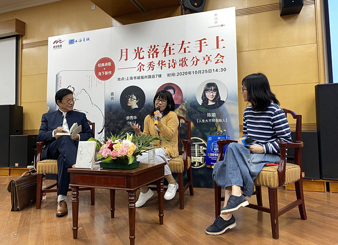 10月25日,诗人余秀华受新经典文化之邀,携新版《月光落在左手上》做客上海书城福州路店,与复旦五浦汇实验学校校长黄玉峰围绕诗歌创作展开对谈。