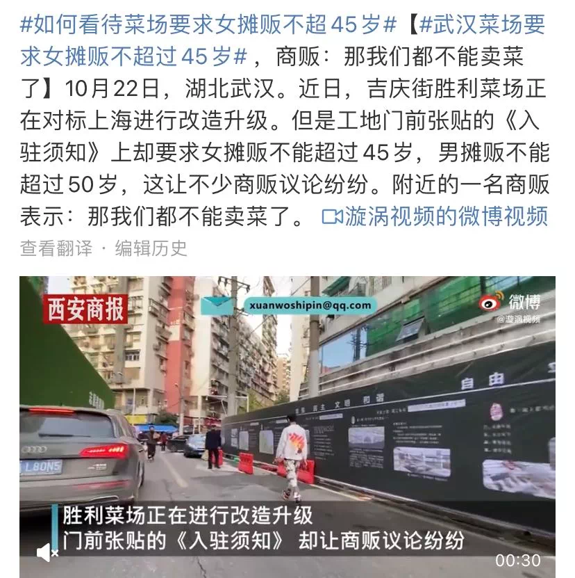 谁能想到,传说中的职场年龄歧视,也落到了菜场商户的头上。新闻就发生在前天的重阳节,菜市场贴出明文规定:“女摊贩不能超过45岁,男摊贩不能超过50岁。”