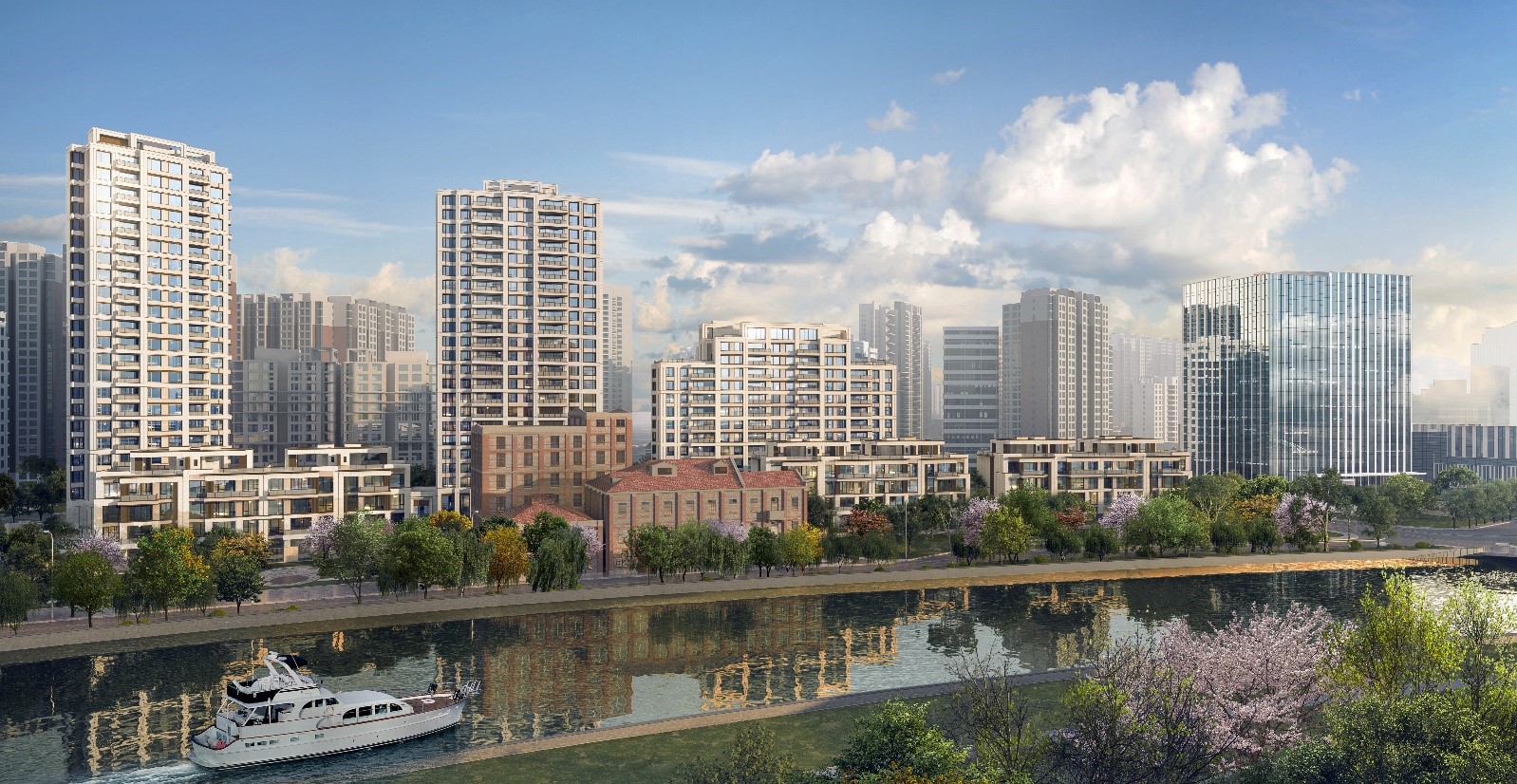 从空中俯瞰,由三栋高层与三栋叠加组成的龙盛•福新里错落有致,形成高层、叠加、河岸、河水四重层次,以层层跌落的姿态探向苏州河水,投入母亲河的柔波之中。