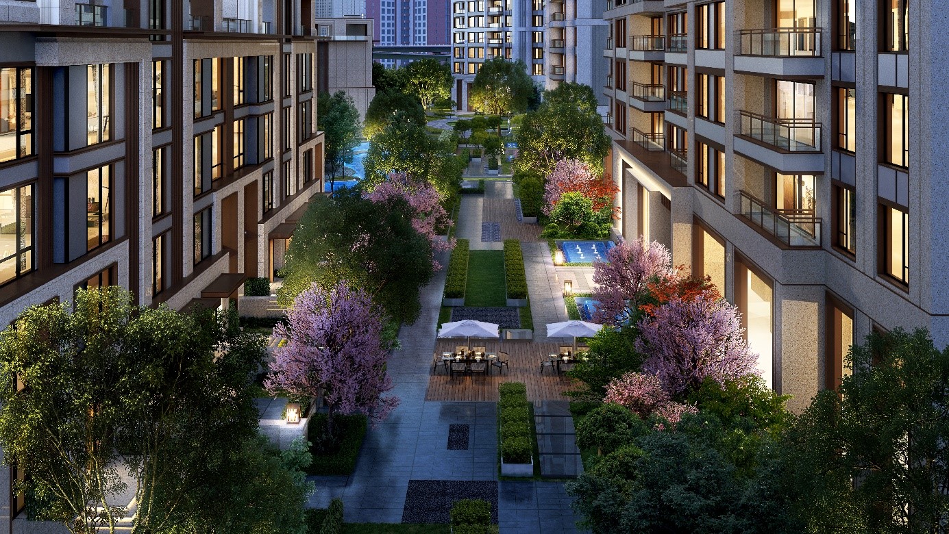 由贝尔高林执笔,水景花园和感官花园以度假风植物景观铺陈出绿意盎然的休闲活动空间,是繁华城央难得一见的私享花园;堂、廊、庭、院、厅,移步换景,五重空间围合成都会秘境,在四季流转中,吐纳自然的清新。