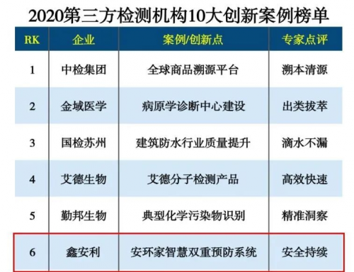 2020年5月,“安环家智慧双重预防系统”入选2020第三方检测机构10大创新案例,被专家点评为“安全持续”;