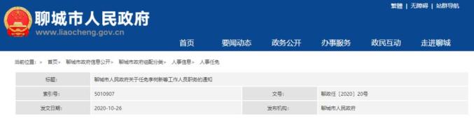 李树新为聊城市人民政府国有资产监督管理委员会副主任(试用期一年);