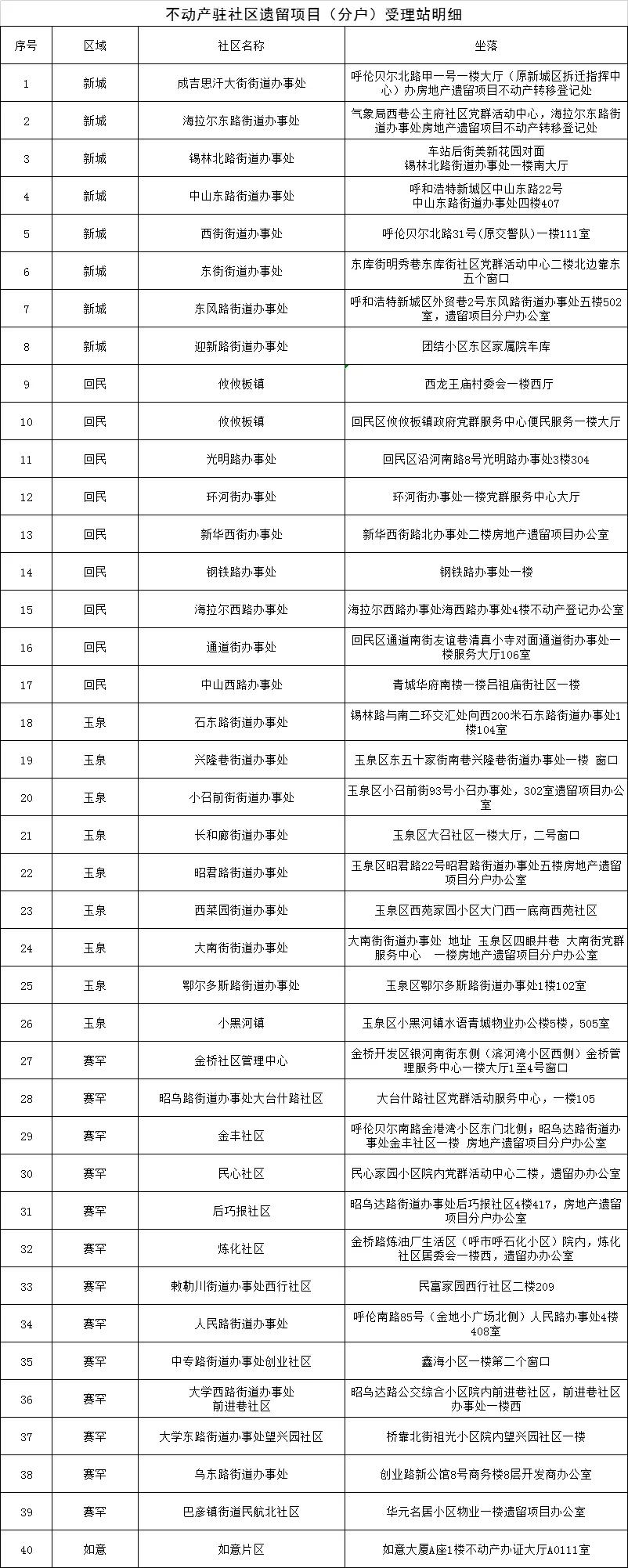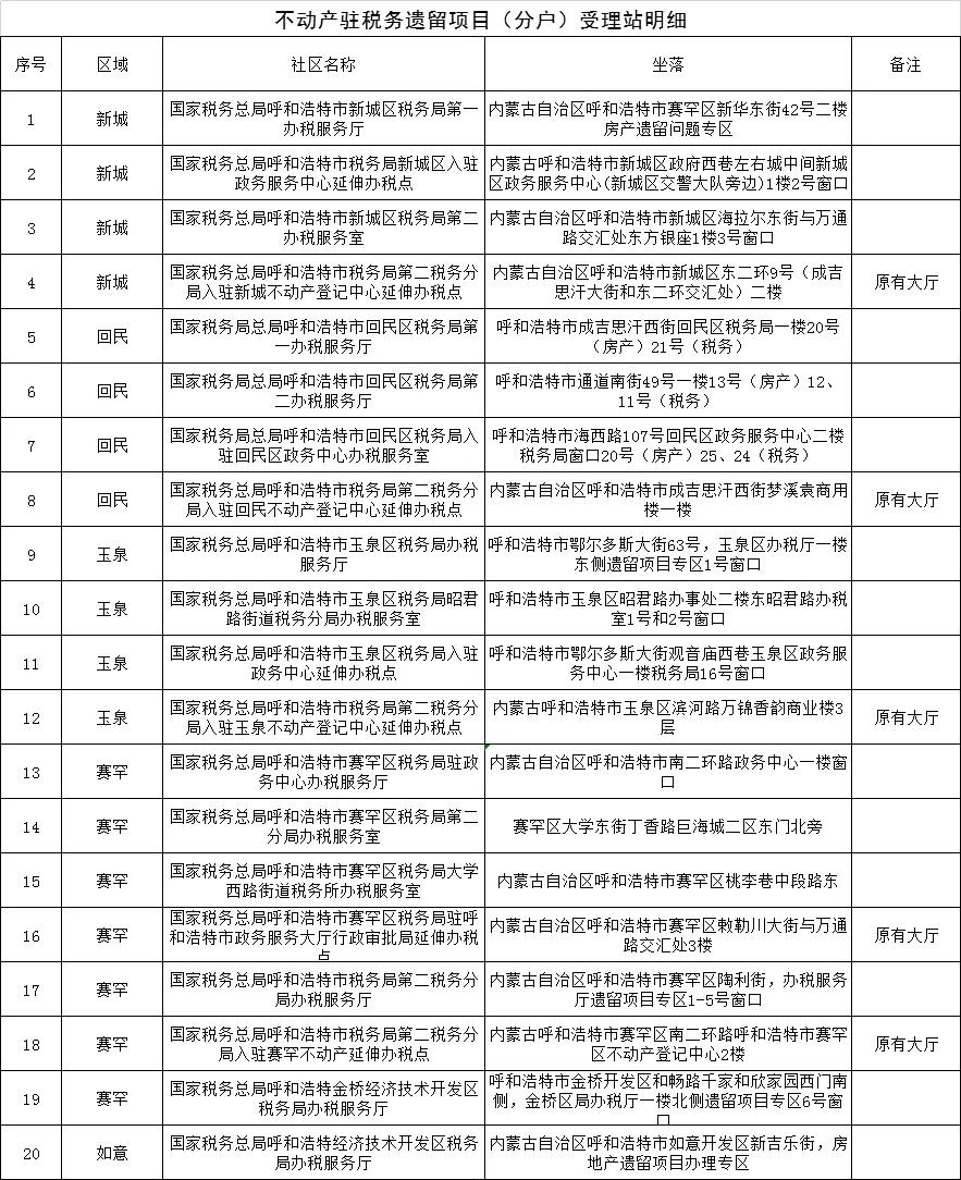按照呼和浩特市委市政府加快推进房地产遗留项目转移登记(分户)工作的安排部署,根据《呼和浩特市房地产遗留项目不动产转移登记(分户)实施方案》的要求,呼和浩特市四区及经济开发区在街道办事处分别设立40个不动产驻社区遗留项目(分户)受理站,呼和浩特市税务局设立20个不动产驻税务遗留项目(分户)受理站(包括市四区不动产登记服务大厅原有的5个受理点),方便百姓就近在社区提交申请材料并缴税,早日拿到证书。